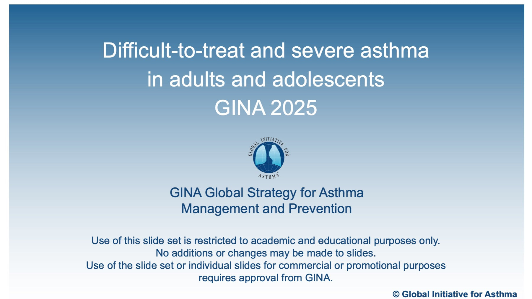 PowerPoint slide set summarizing GINA’s objectives, documents, and management recommendations from the 2025 update of the GINA Strategy Report, with background information about asthma and the burden of this disease.